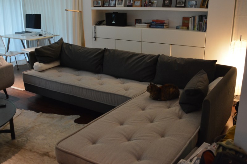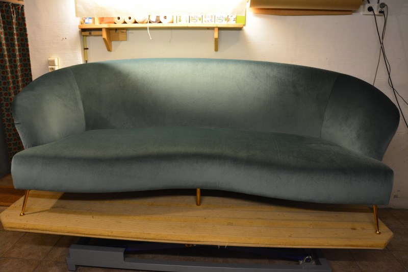 curved sofa van Eichholtz opnieuw gestoffeerd met veloursstof in de kleur ‘Ocean’ 🙂