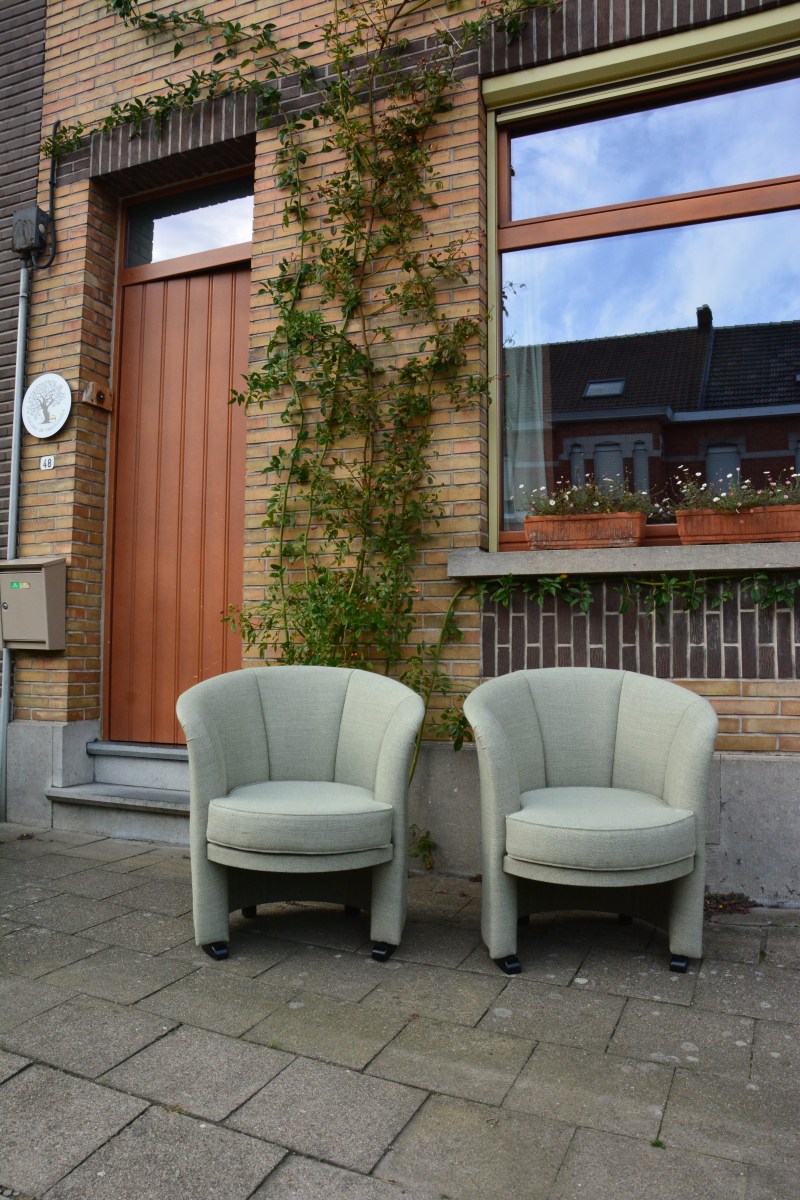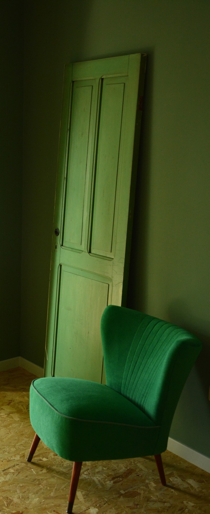 Dit expo 58 coctailzeteltje in rood kunstleder werd compleet vernieuwd en gestoffeerd in een groene zachte stof, bijpassende bies in lichtgroen.