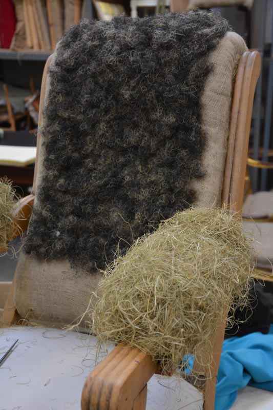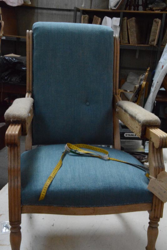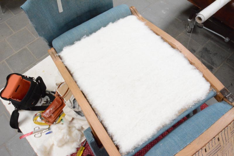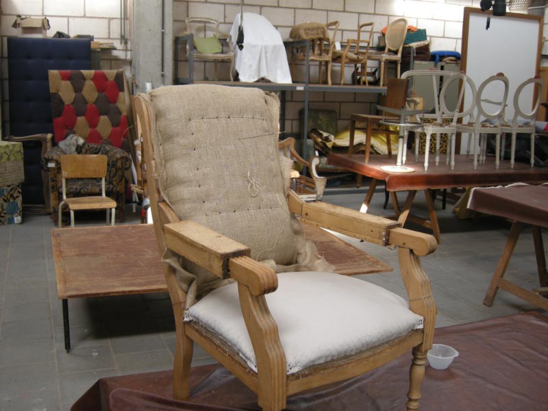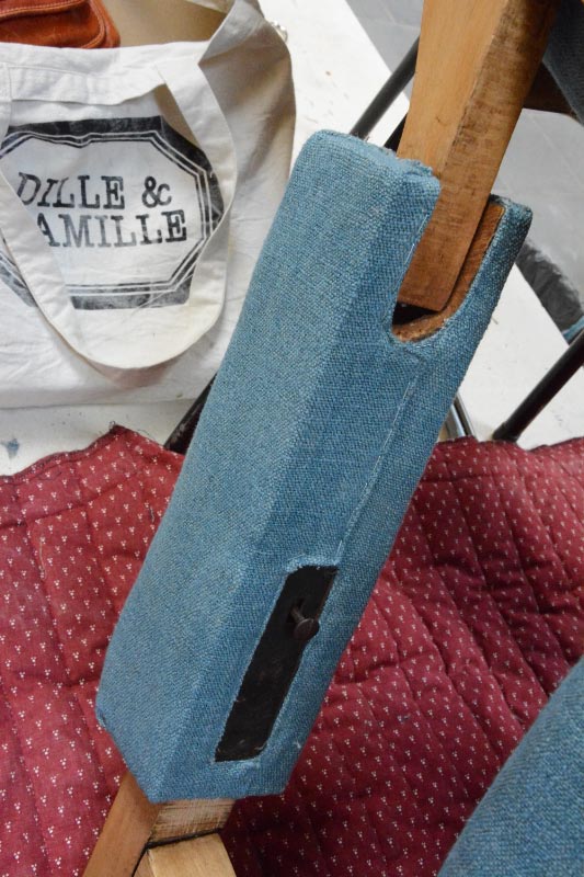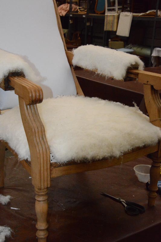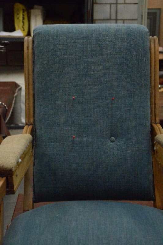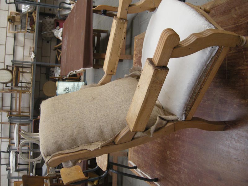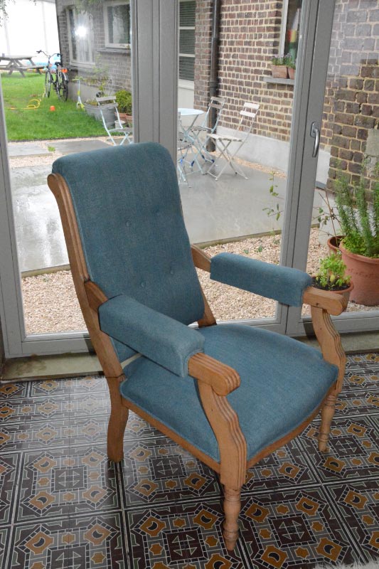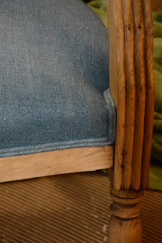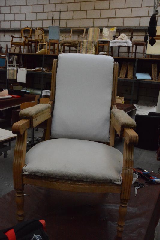 Opa’s zetel werd helemaal vernieuwd en terug opgebouwd volgens de traditionele manier met crin en paardenhaar. De herstoffering gebeurde met linnen stof van Bruder & Co.