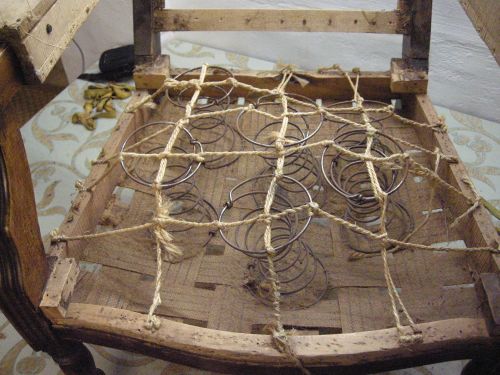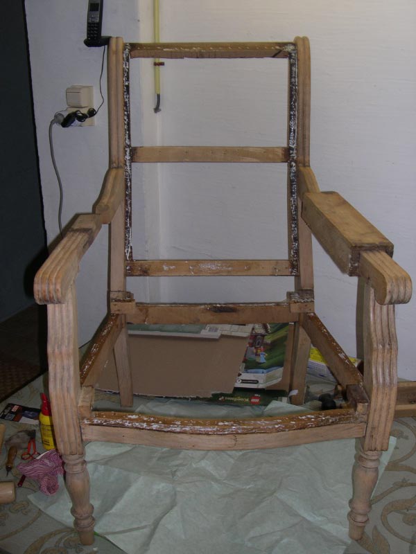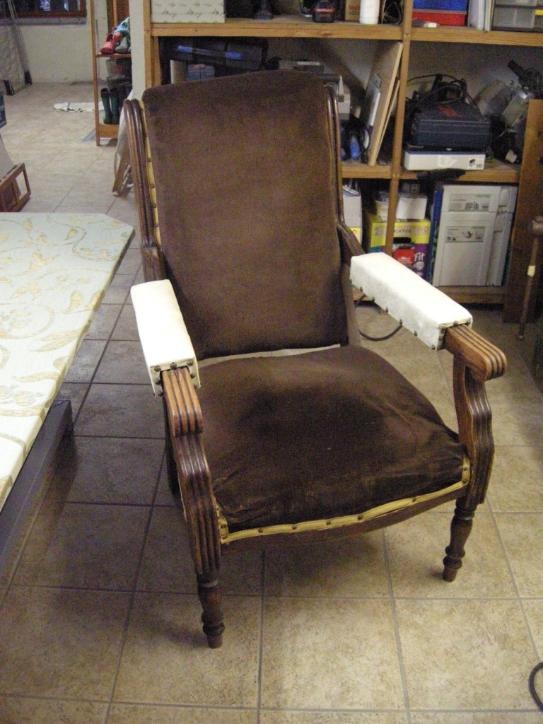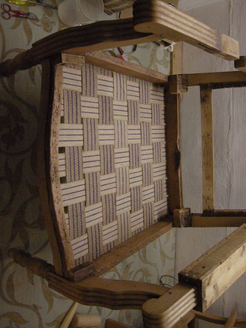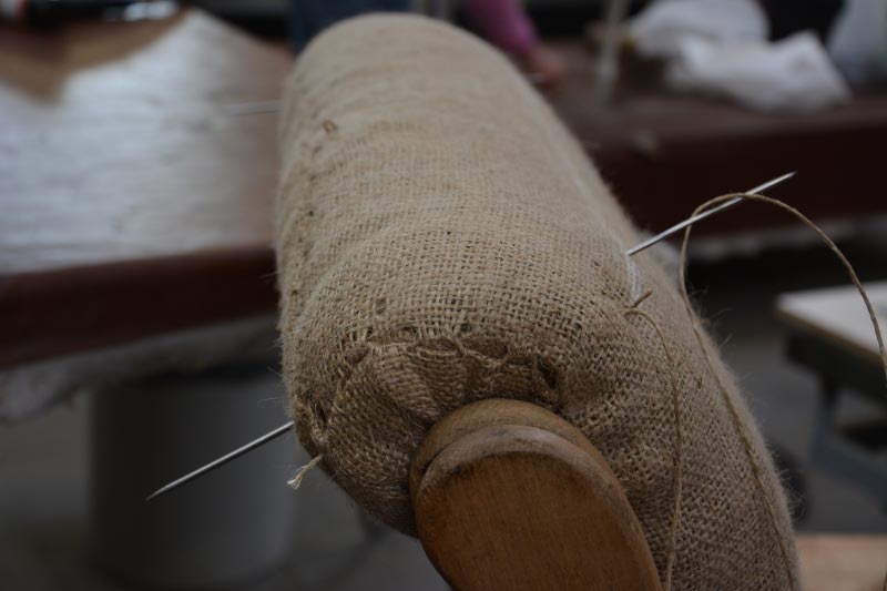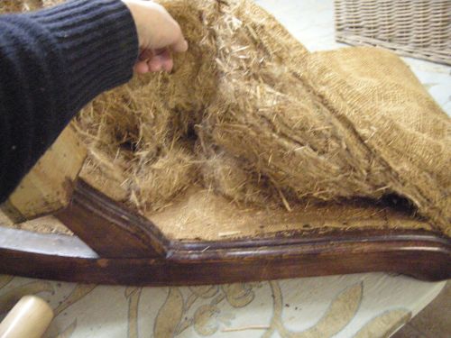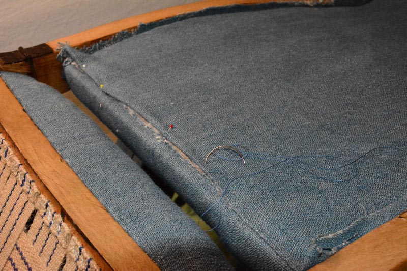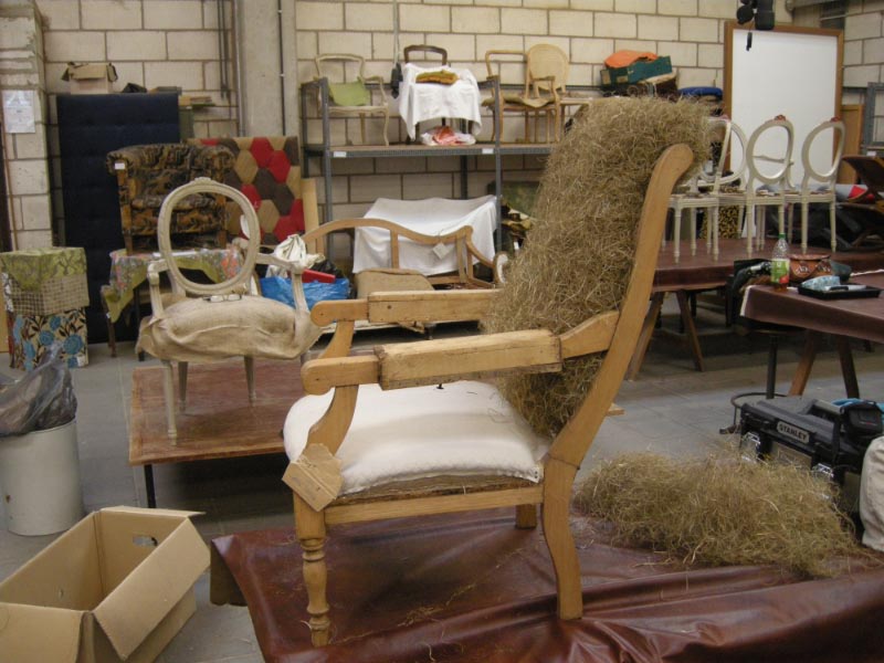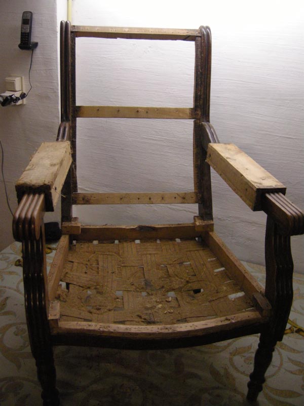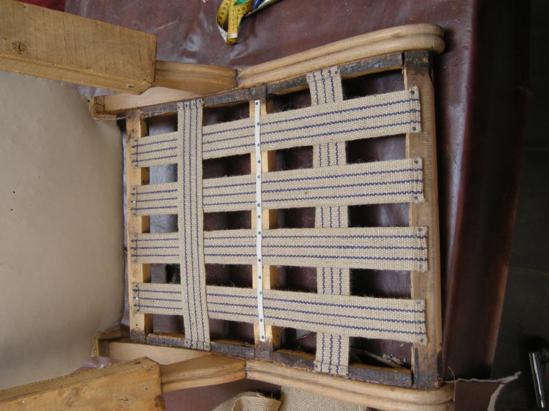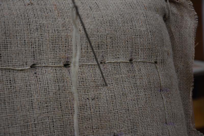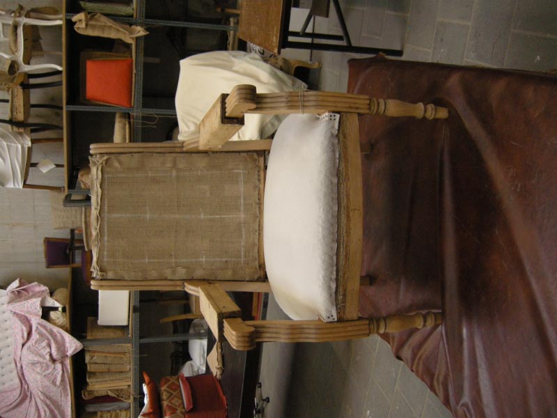 Opa’s zetel werd helemaal vernieuwd en terug opgebouwd volgens de traditionele manier met crin en paardenhaar. De herstoffering gebeurde met linnen stof van Bruder & Co.