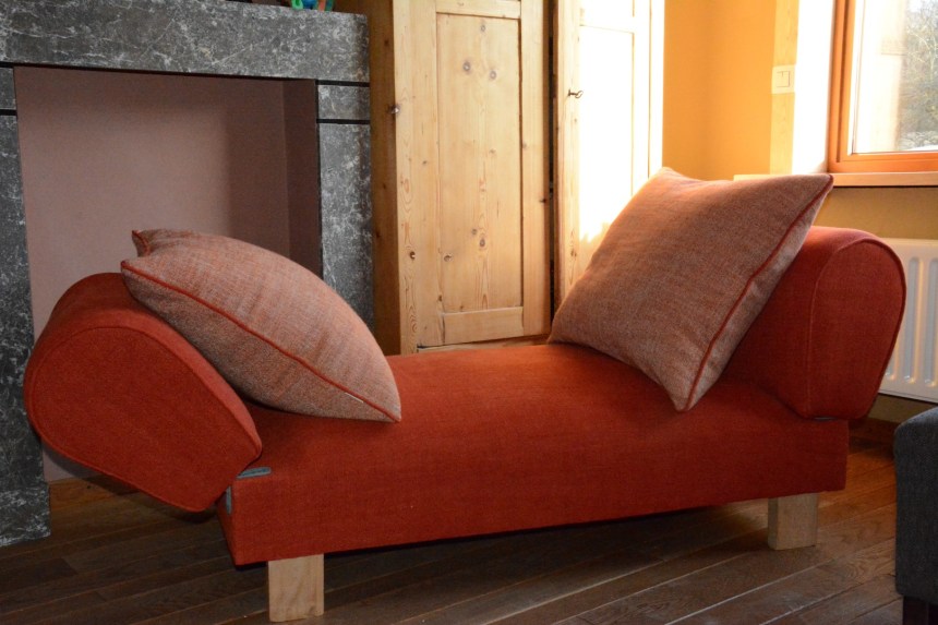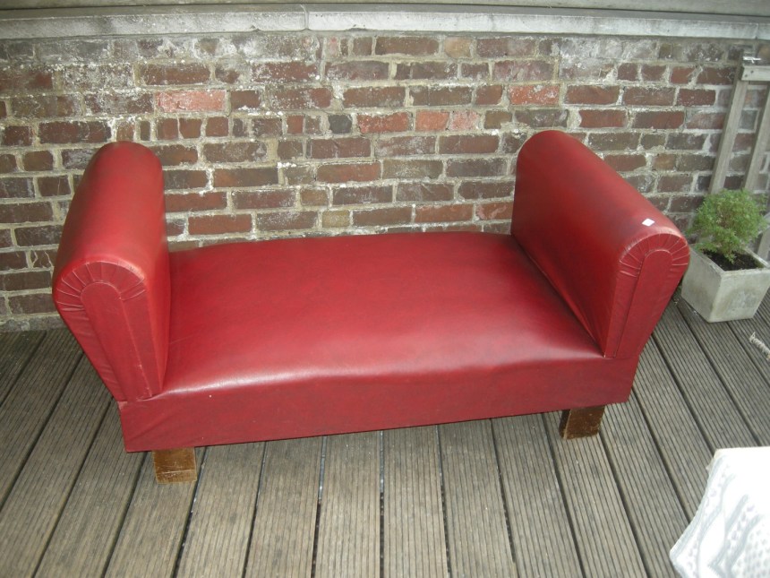 Het oude exemplaar, gevonden in de kringwinkel en overtrokken met kunstleder, werd volledig heropgebouwd en met een leuke rode stof (Bruder&Co) bekleed.