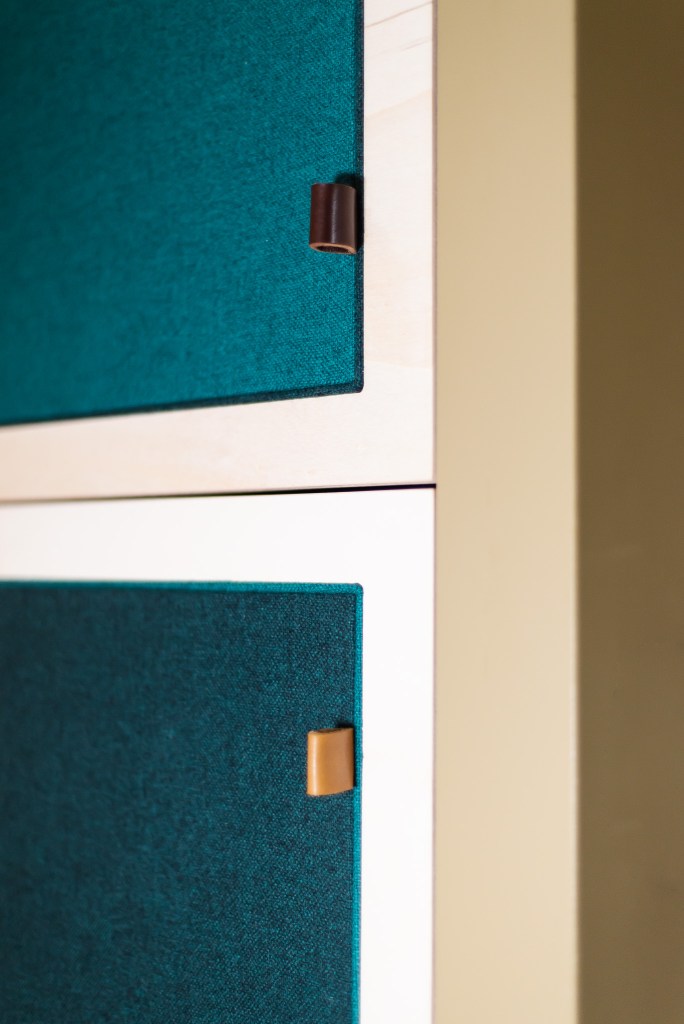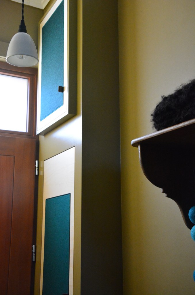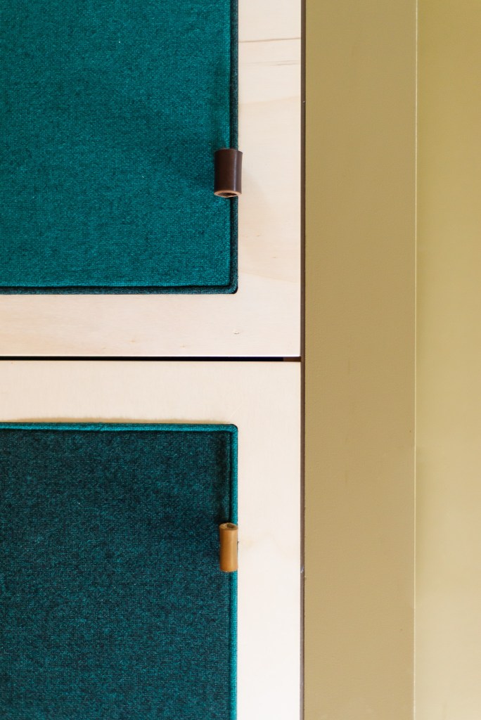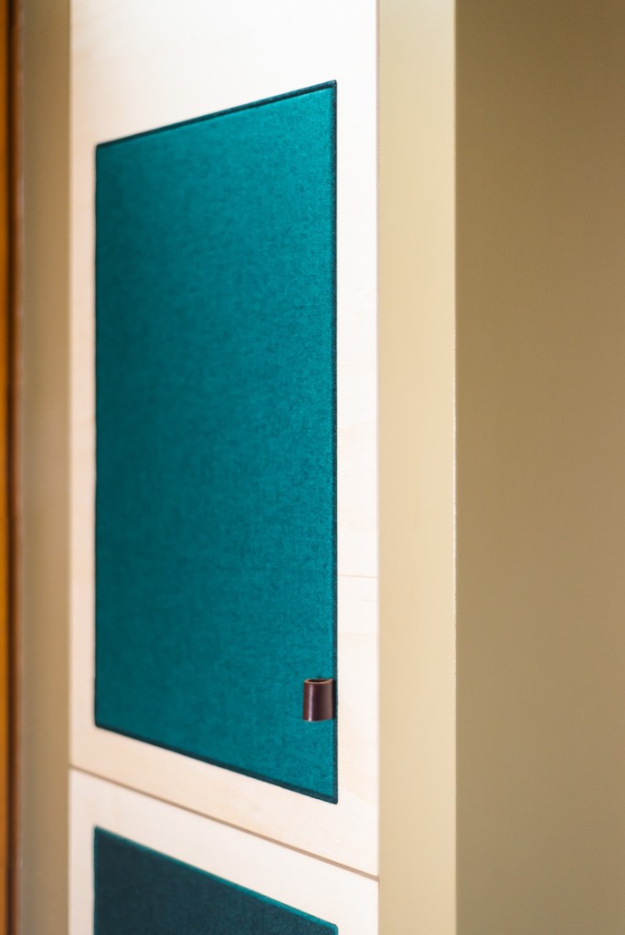 Afkasting op maat: het wegbergen van een elektriciteitskast en meteen ook nog wat extra opbergruimte. Creatief met multiplex berk deurtjes en gestoffeerd accent (Kvadrat stof ‘Tonica’).