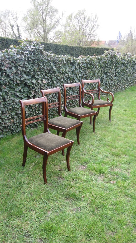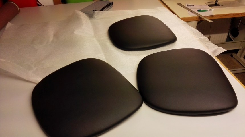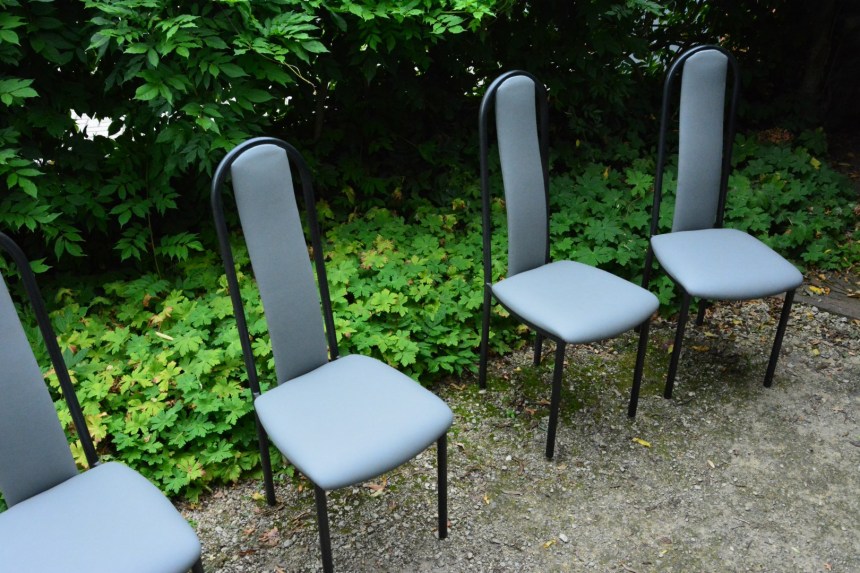 Losse stoelzitten, hier voorzien van nieuwe mousse en herbekleed met kunstleder. De mousse van de rug was nog intact zodat enkel de bekleding moest vernieuwd worden.