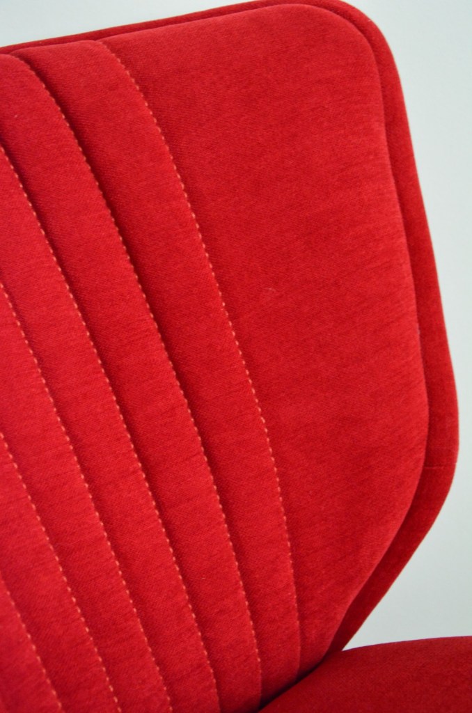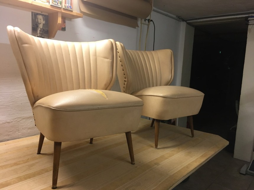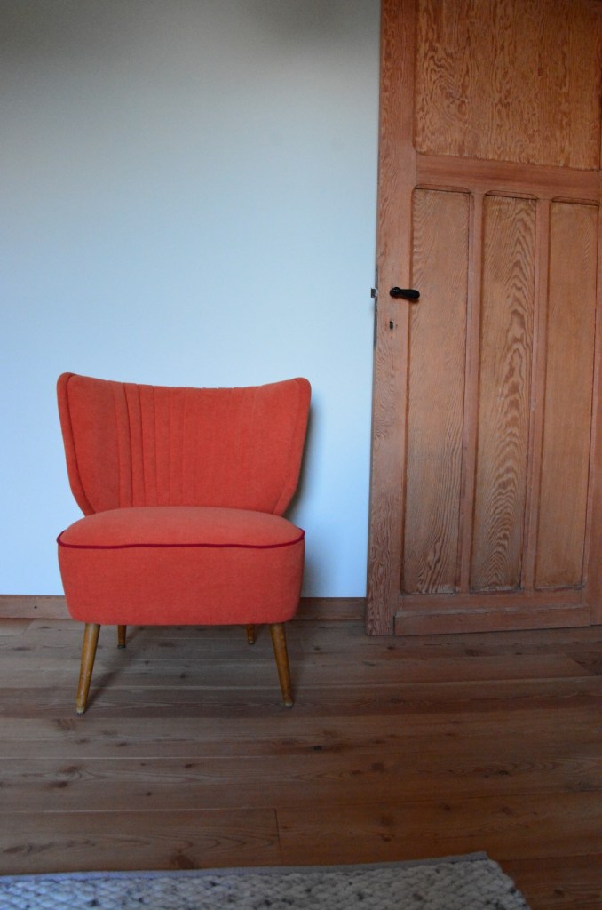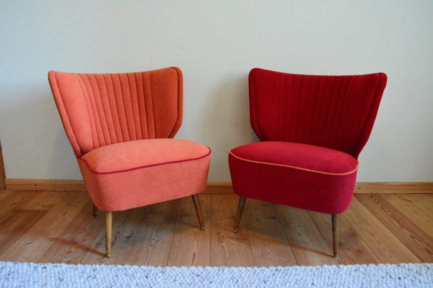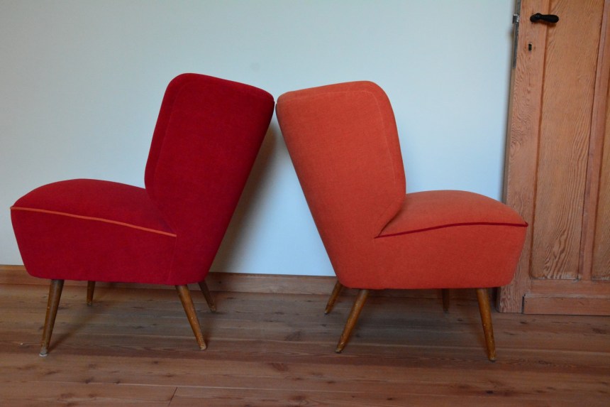 Deze 2 zeteltjes in kunstleder werden compleet onder handen genomen en gestoffeerd in warm rood en oranje, met constrasterend biesje en stiksel in de rug.