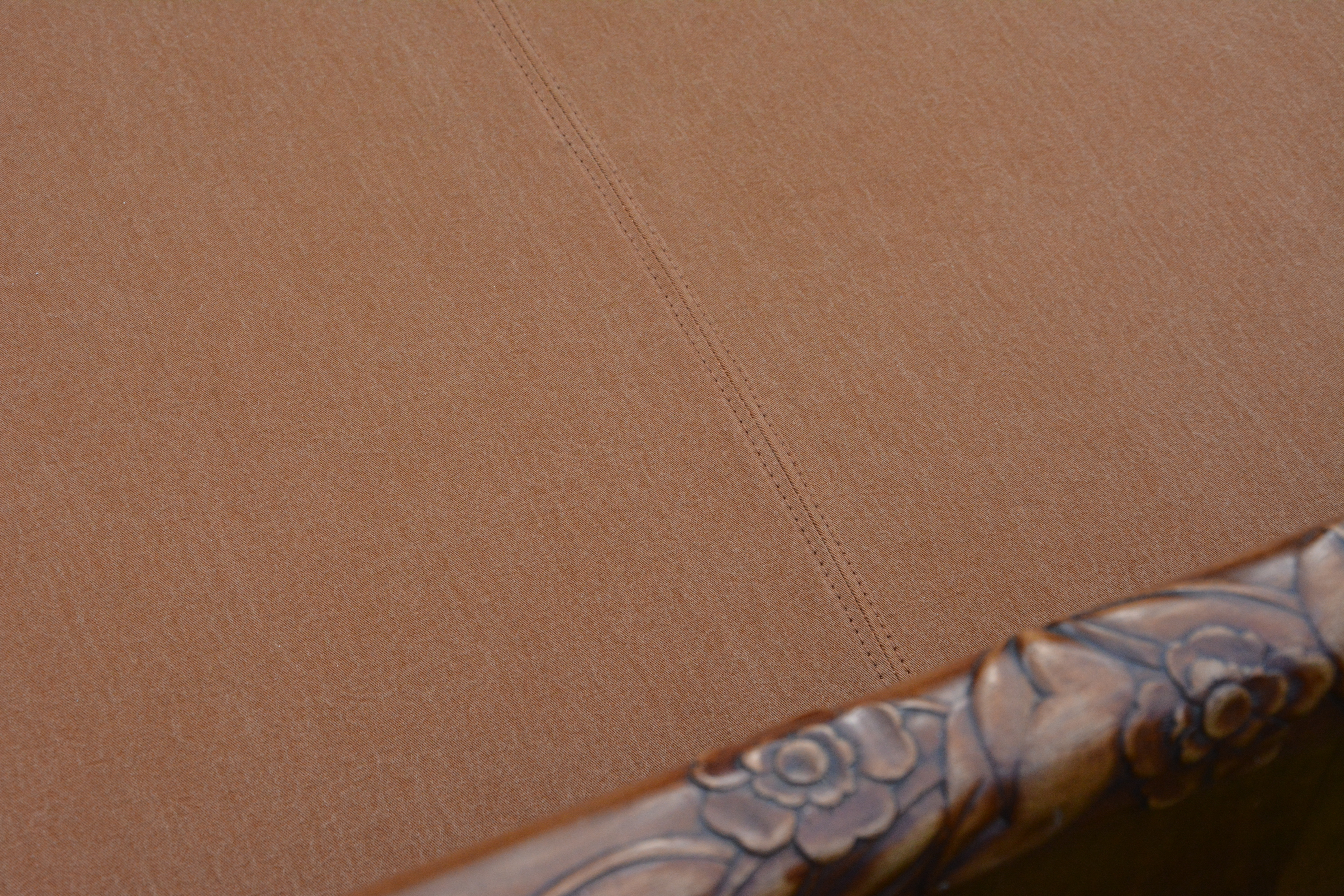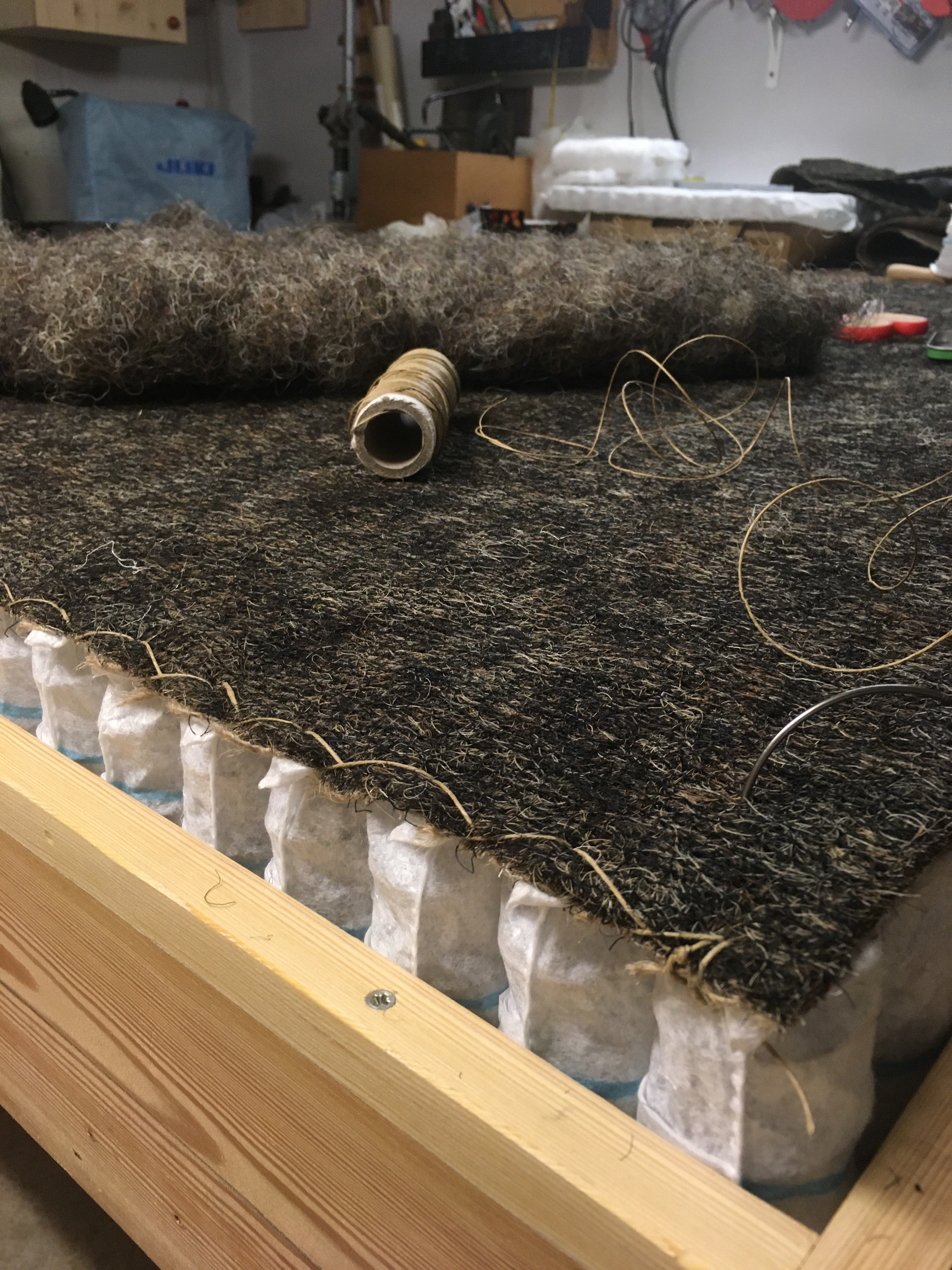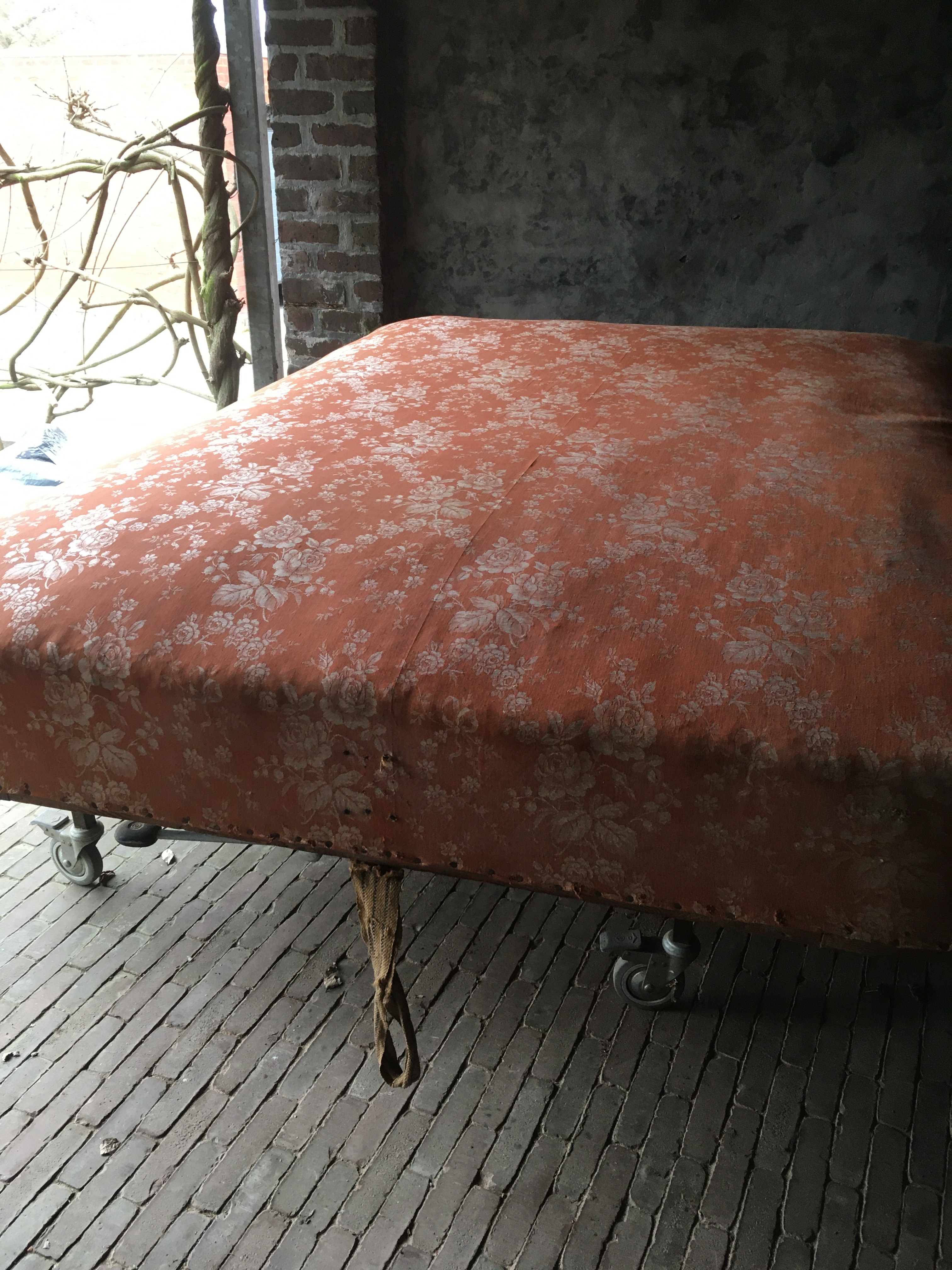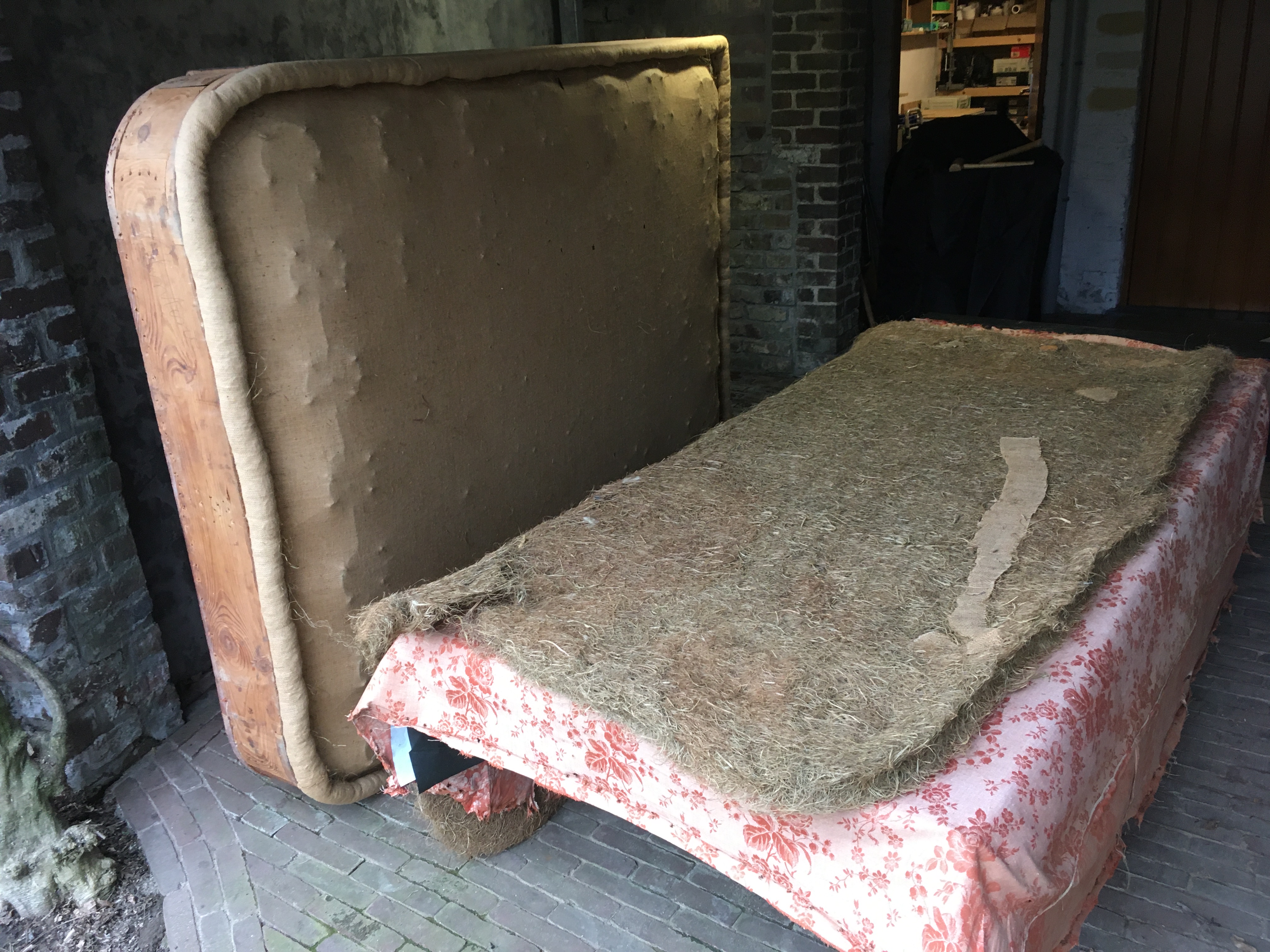 De boxspring werd volledig vernieuwd. Het kader werd verstevigd, nieuwe lattenbodem op maat gemaakt. De oude veren werden vervangen door pocketveren en afgedekt met paardenhaar en katoen. Stoffering met de stof Gitano van Designs of the Time.