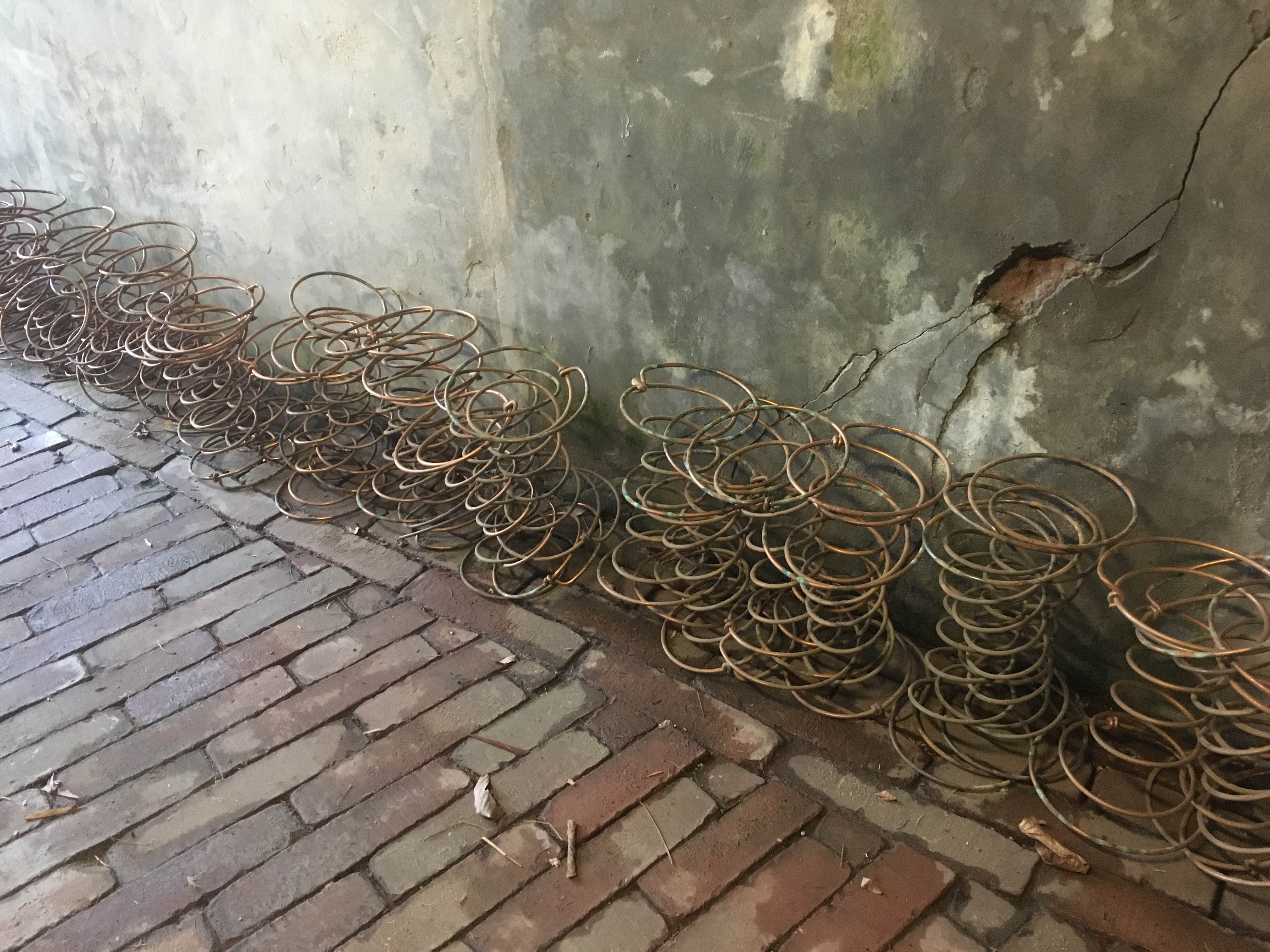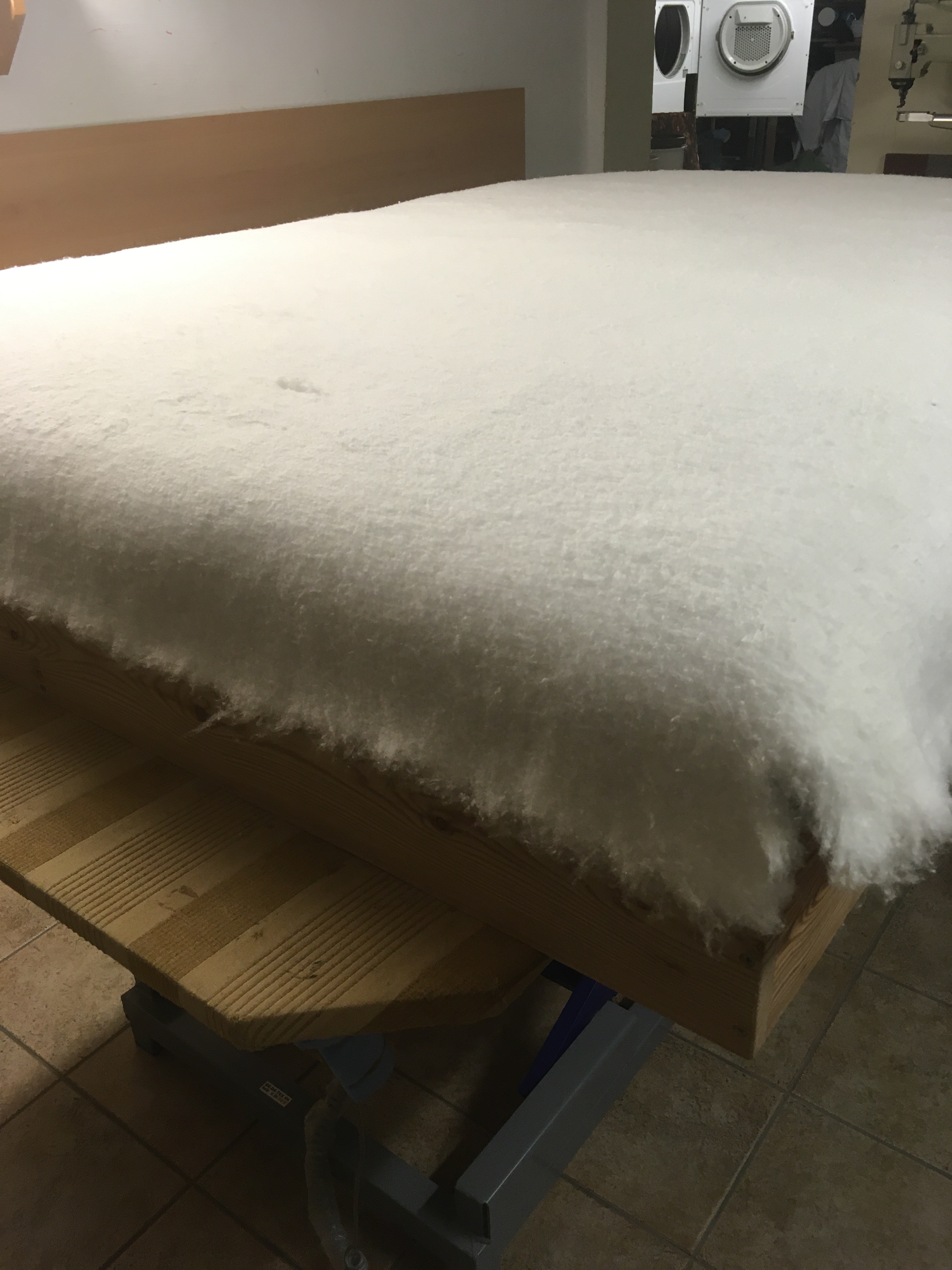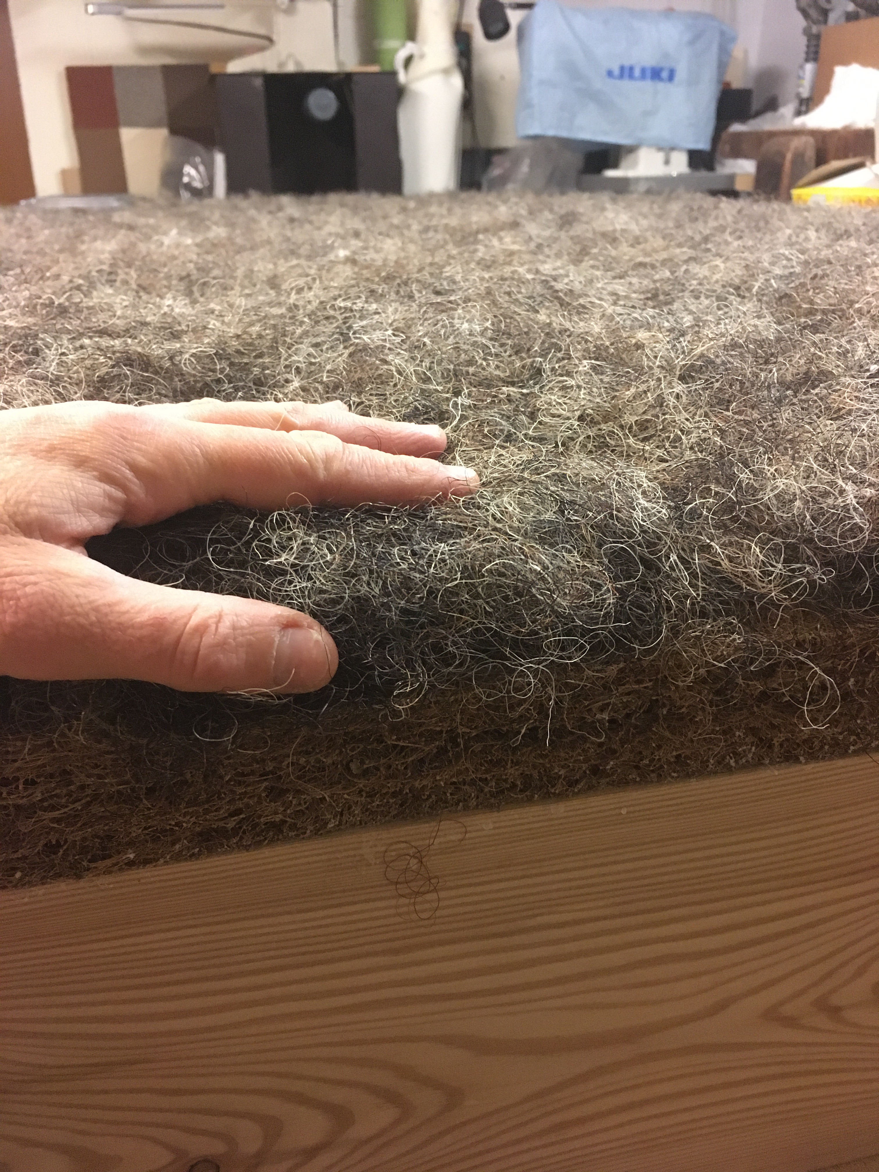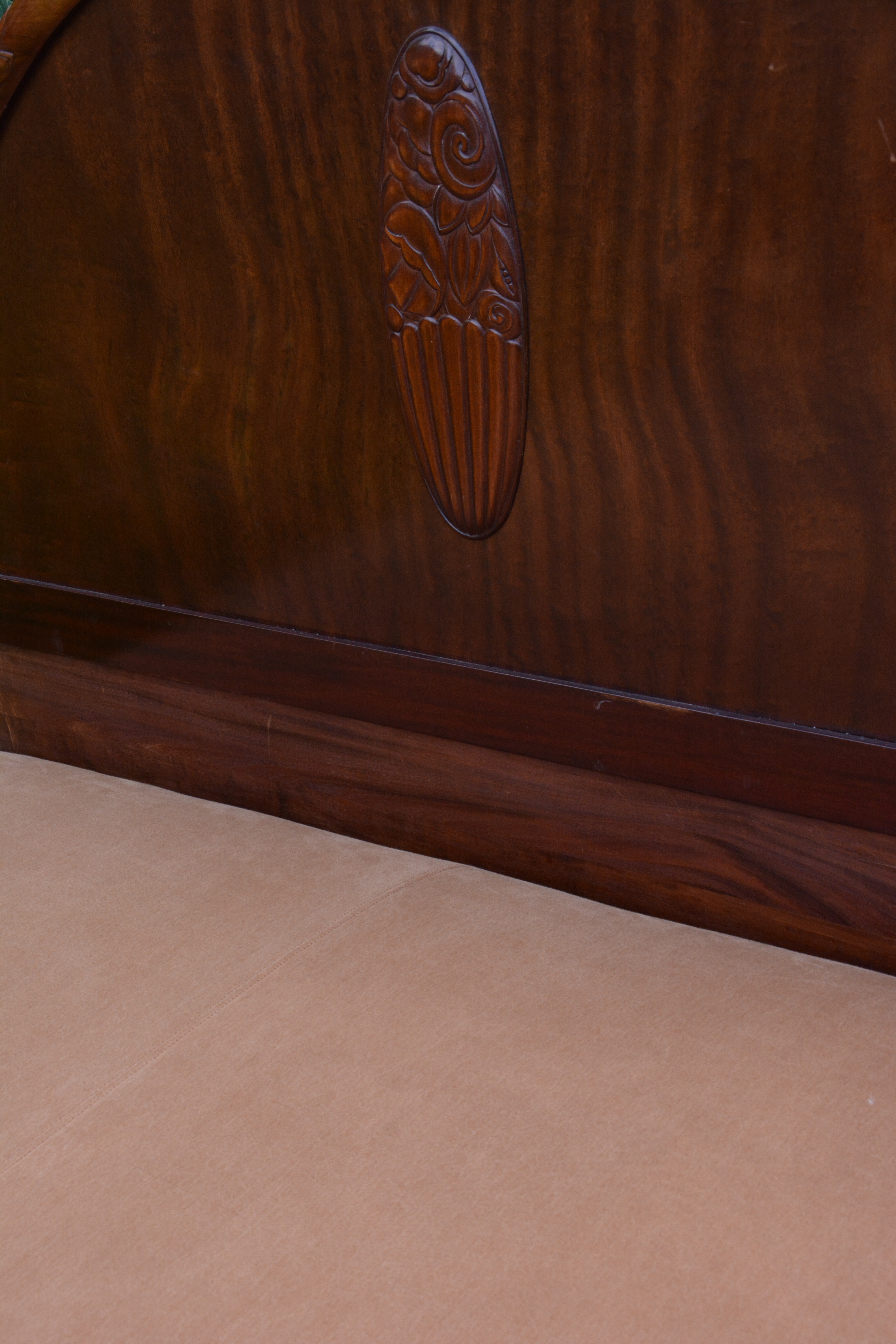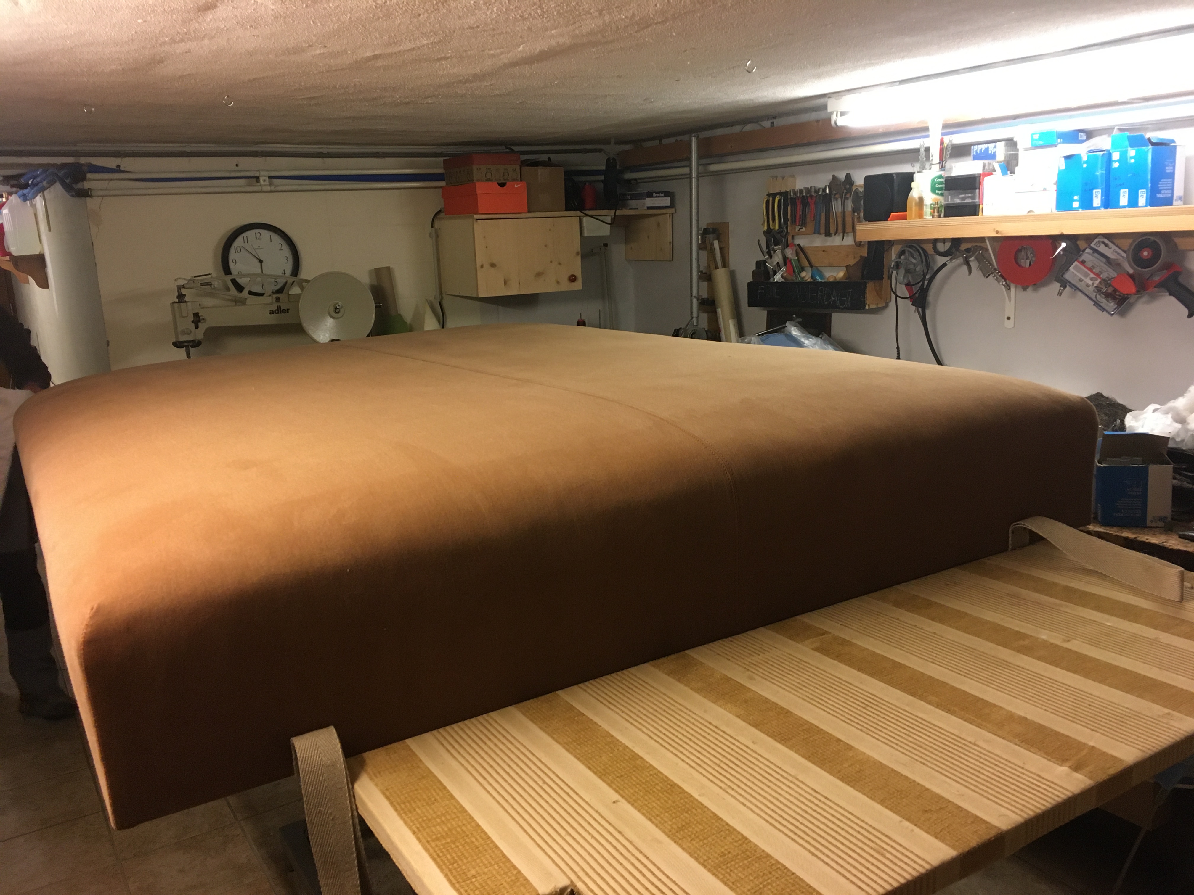 De boxspring werd volledig vernieuwd. Het kader werd verstevigd, nieuwe lattenbodem op maat gemaakt. De oude veren werden vervangen door pocketveren en afgedekt met paardenhaar en katoen. Stoffering met de stof Gitano van Designs of the Time.