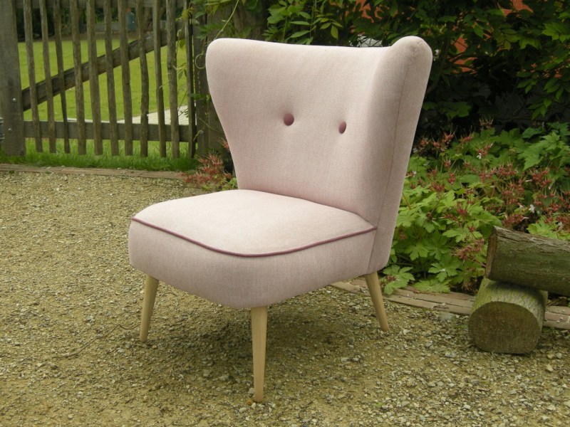 Dit expo 58 coctailzeteltje in rood kunstleder werd compleet vernieuwd en gestoffeerd in een groene zachte stof, bijpassende bies in lichtgroen.