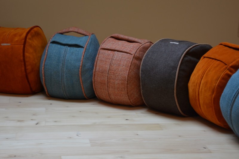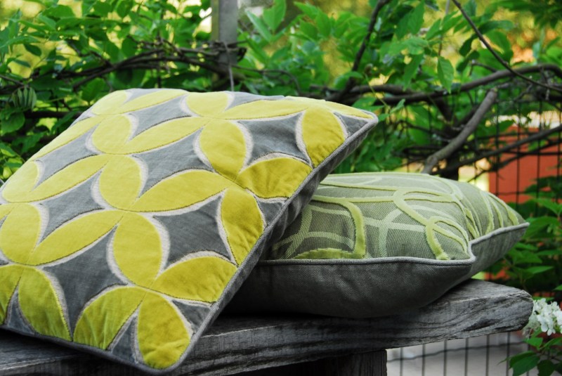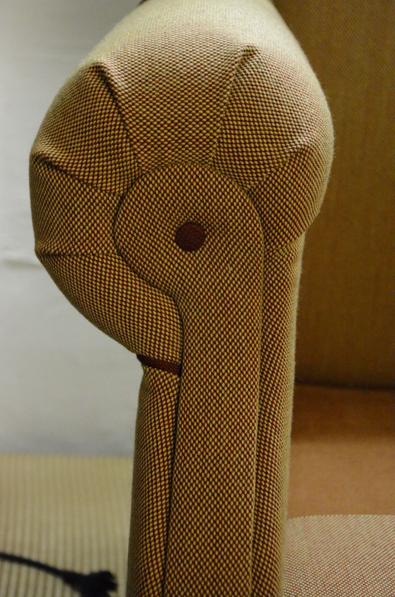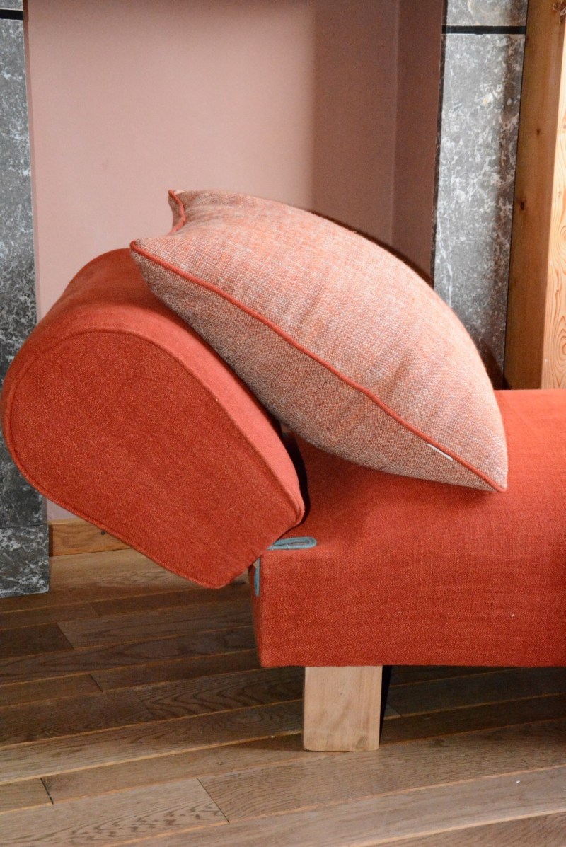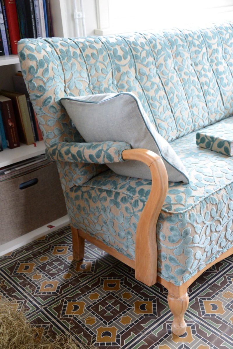 stoffering met linnen stof, kussens afgewerkt met bies.