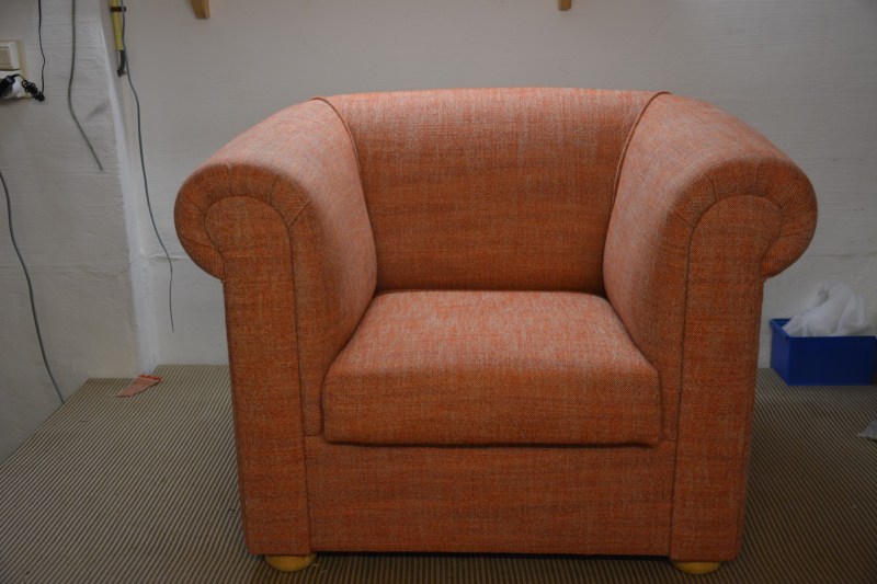 stoffering met stof van Bruder & Co, afwerking met knopen en dubbele bies