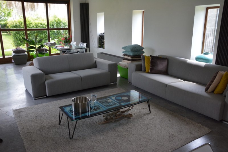Gestoffeerde stoelen en massieve beuken boolplank als bureau vormen samen een leuke en gezellige werkplek! Alles volledig op maat en handmade in ons atelier.